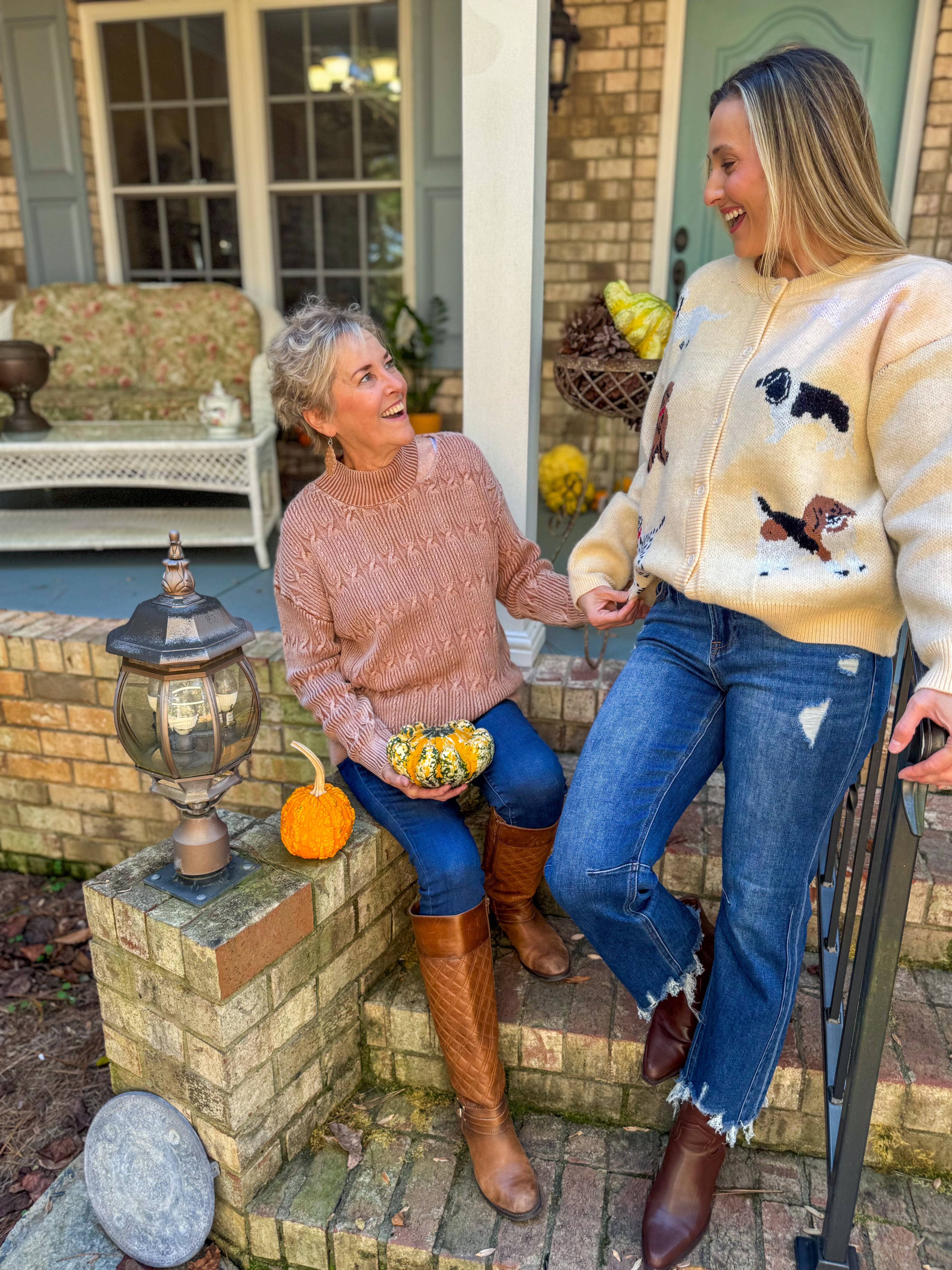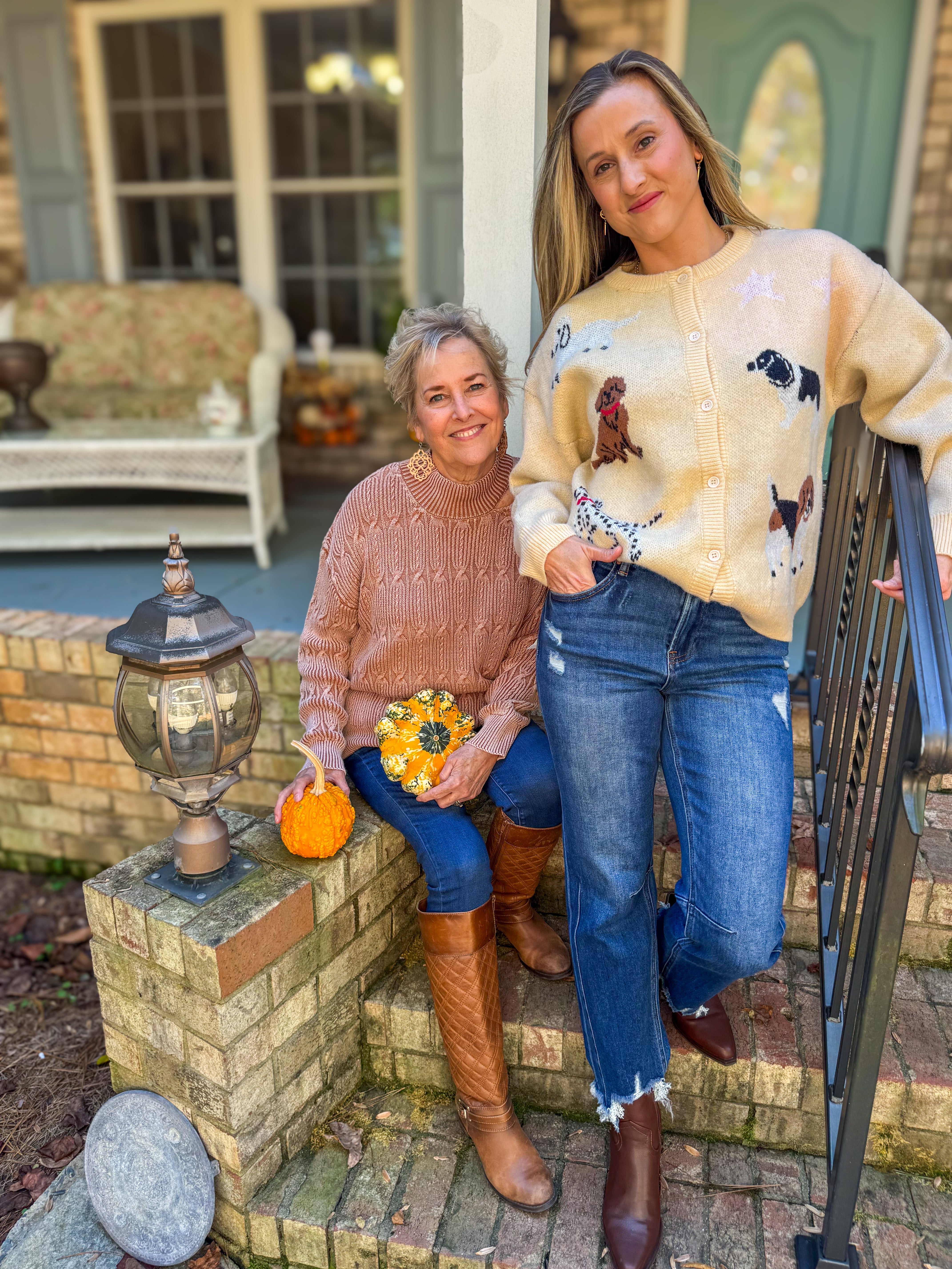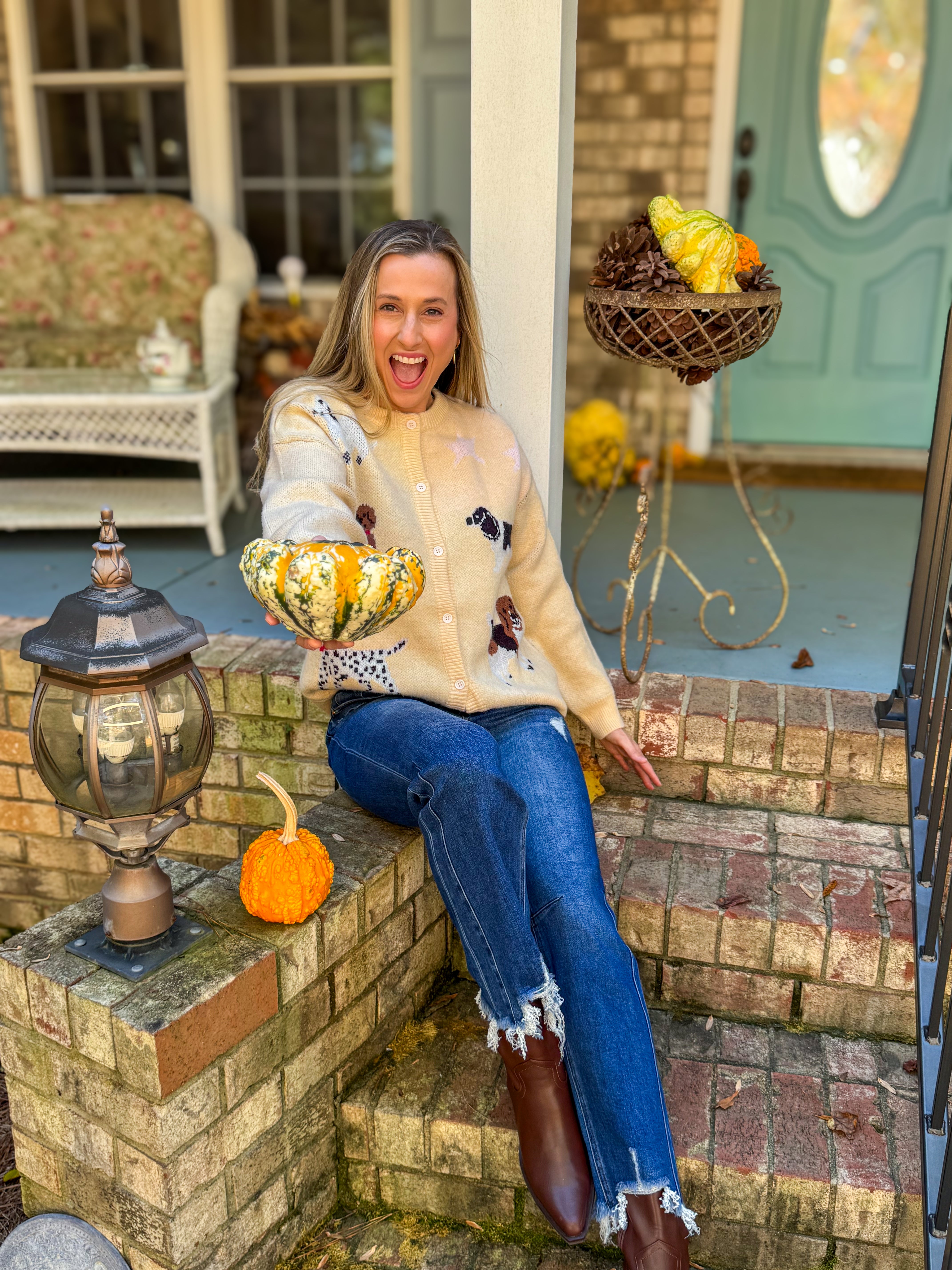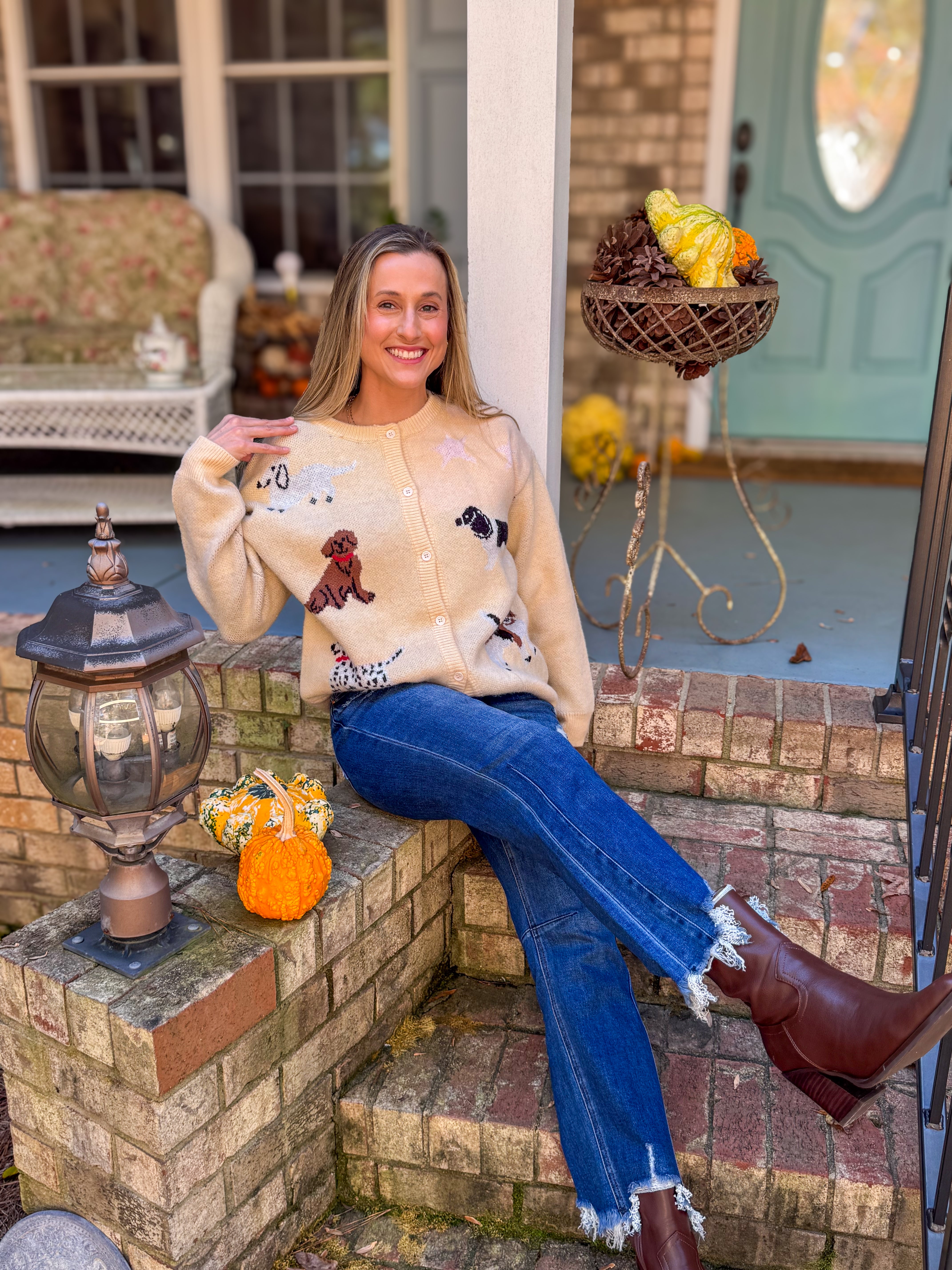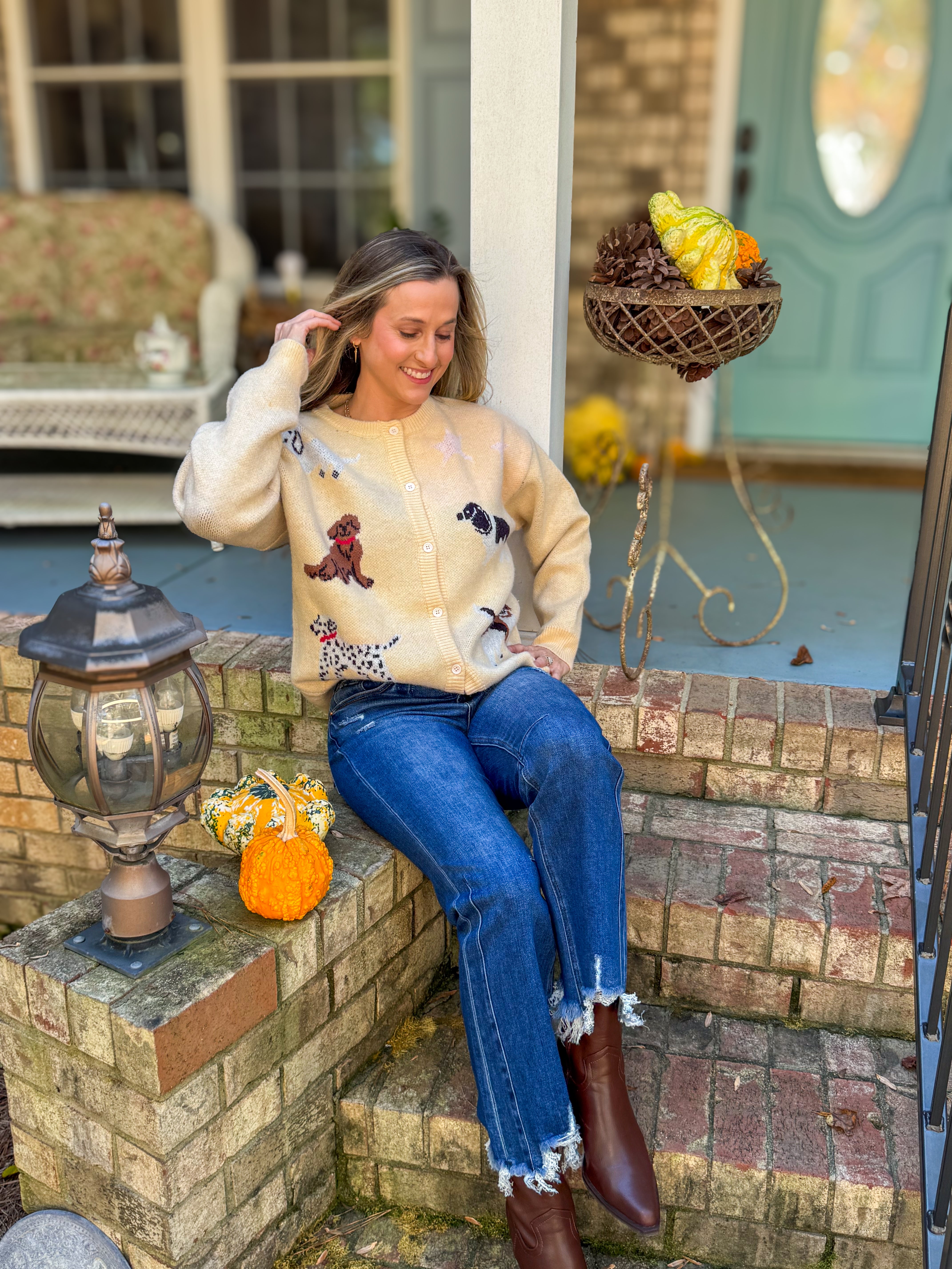 Dog knit sweater cardigan + Button down placket + Round neckline + Drop shoulder long sleeves with ribbed cuffs + Relaxed bodice