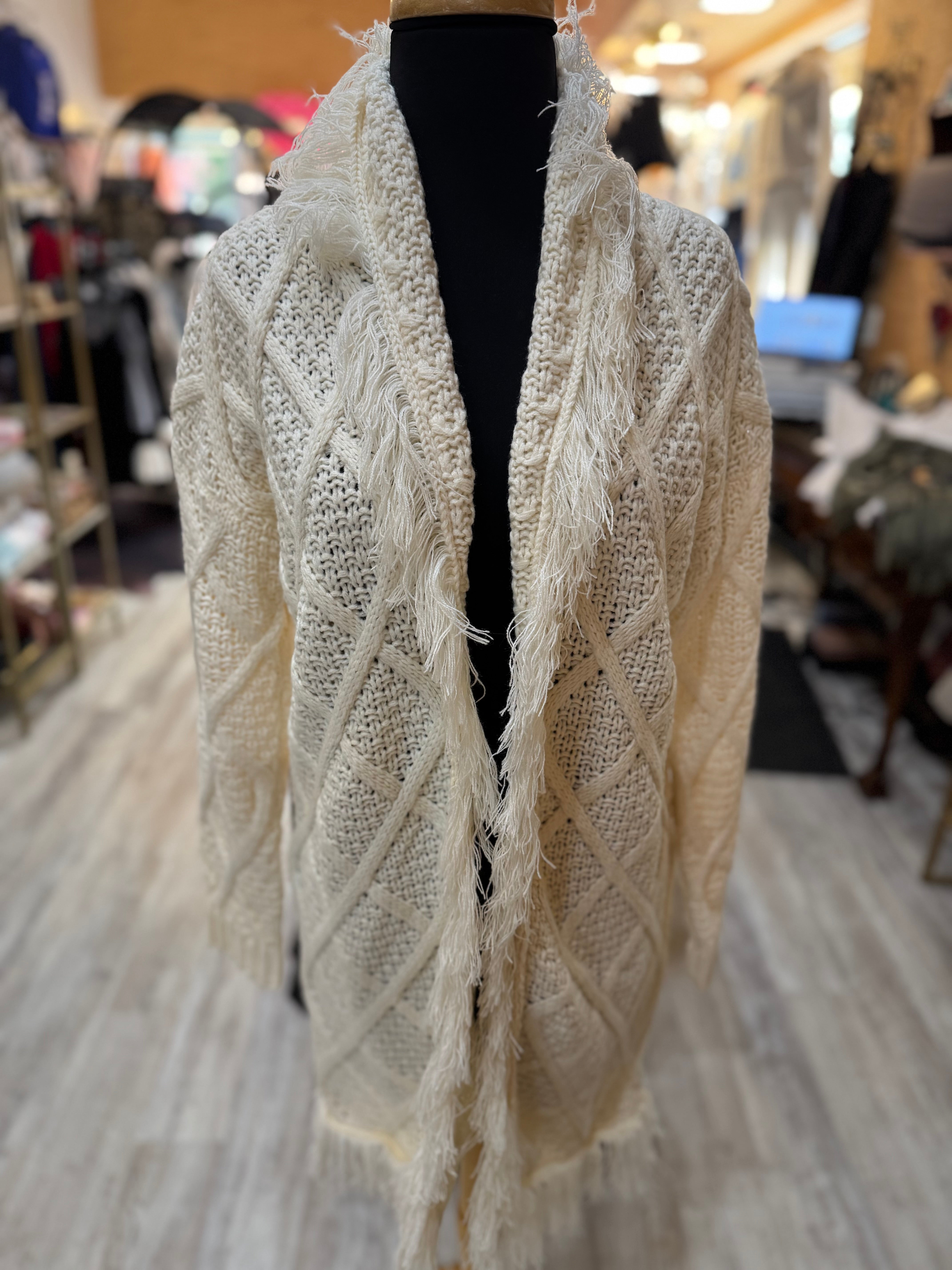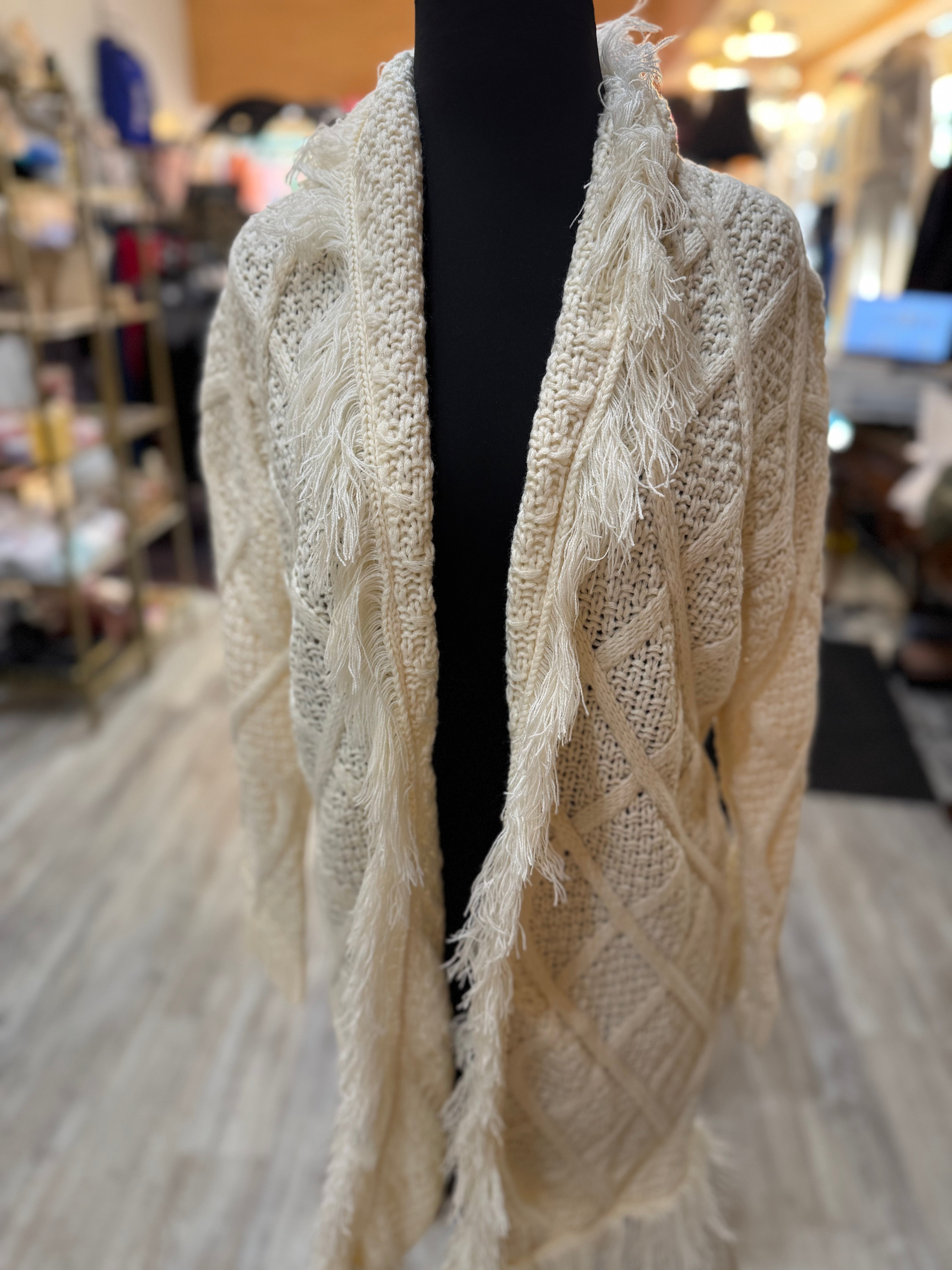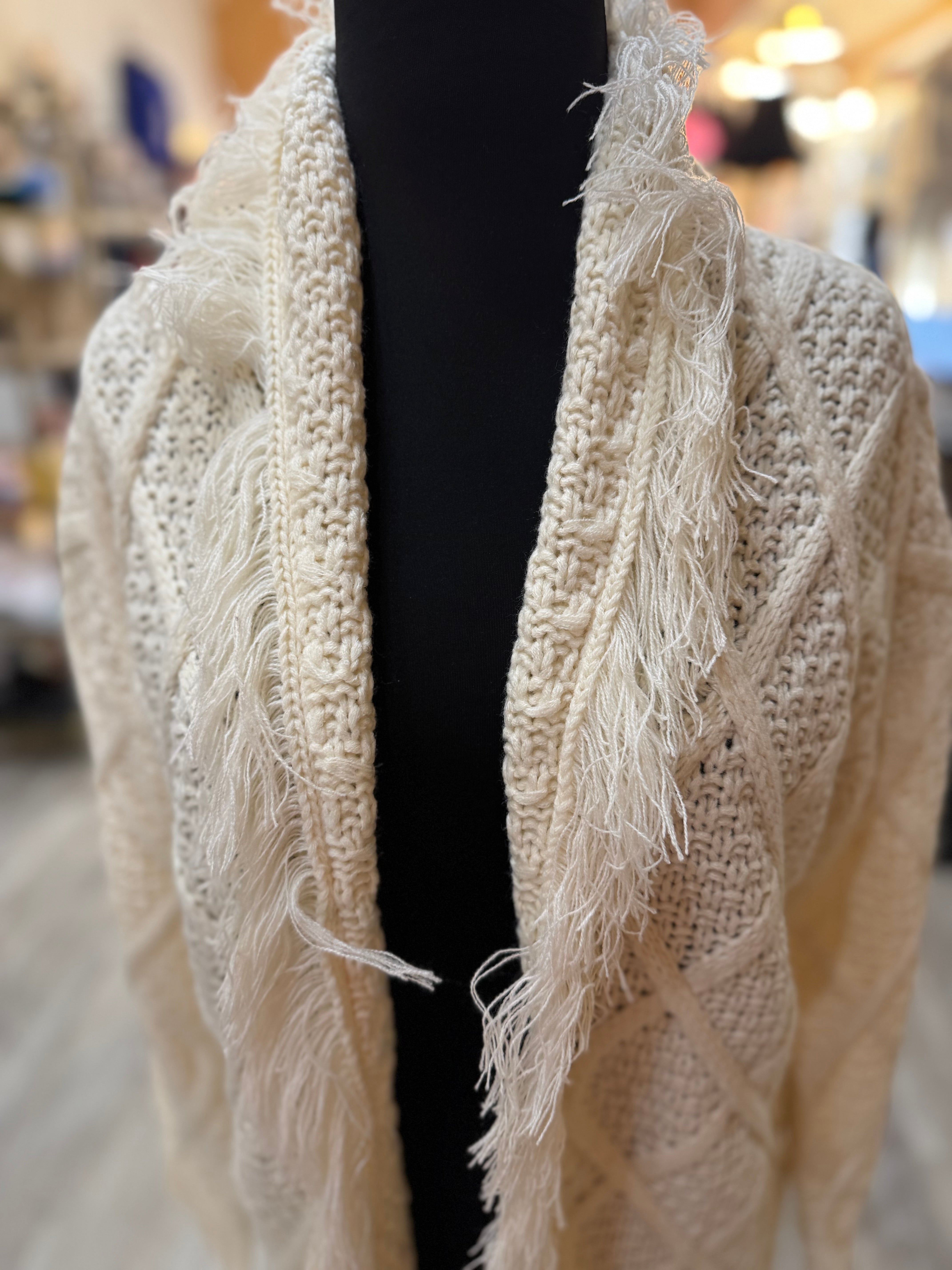 a cozy cable knit cardigan with a soft fringe trim and open front design.