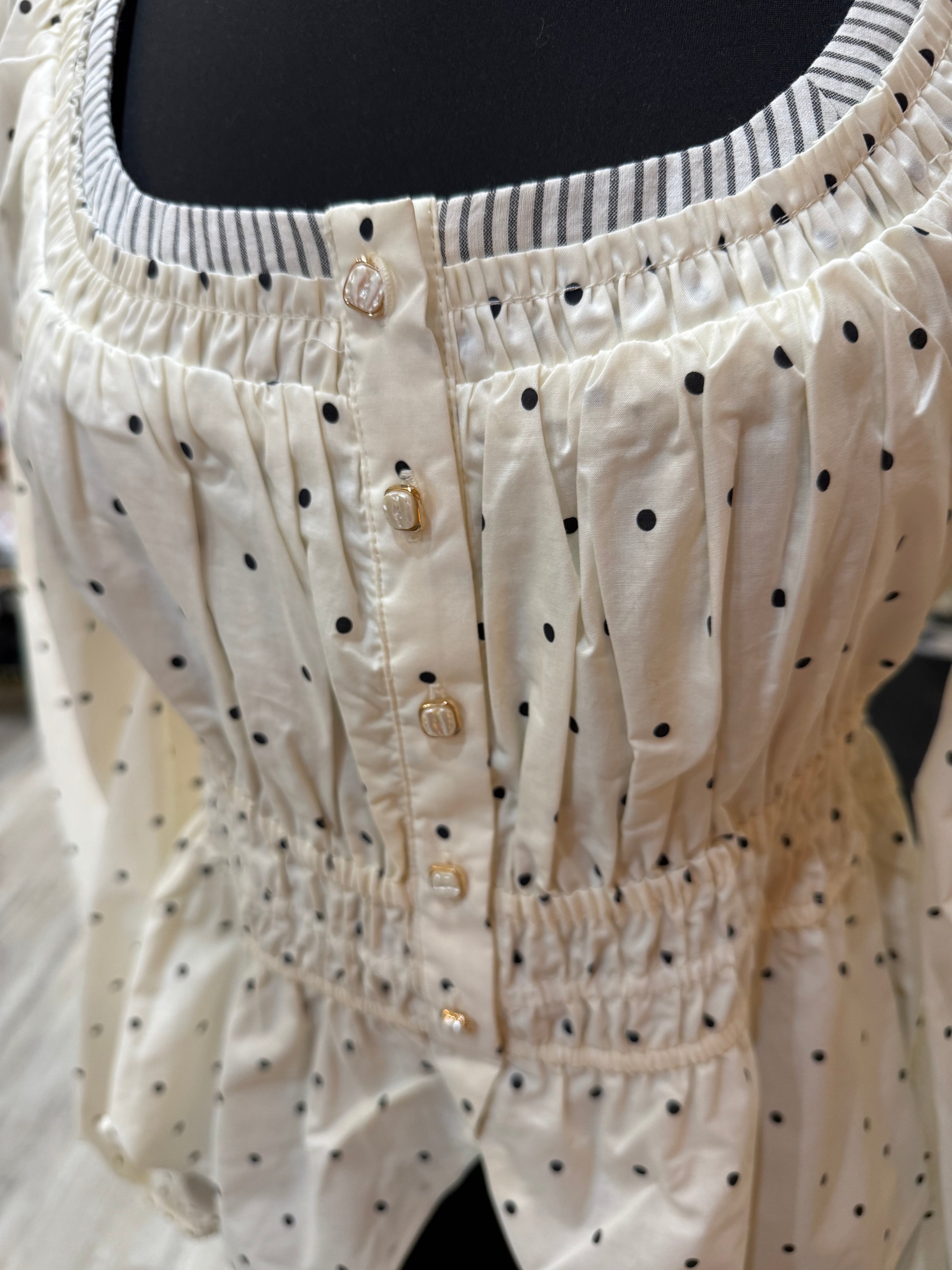 the romantic cream blouse with delicate black polka dots. the gathering waist adds a flattering, waist-defining silhouette, making it perfect for dressing up or down. Pair with tailored pants for a polished look or denim for effortless style.