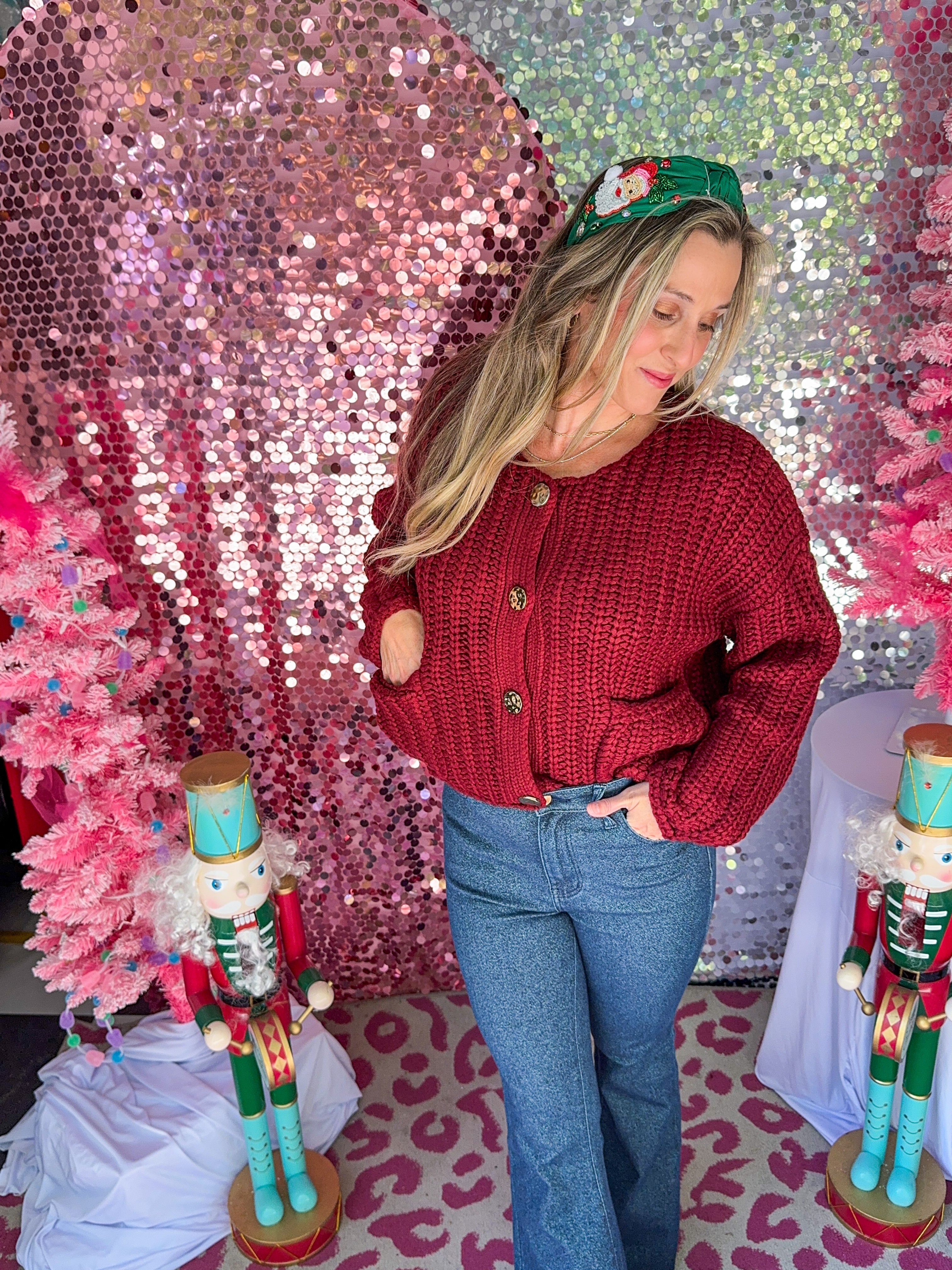 Cropped style acrylic sweater with large gold buttons in a beautiful cranberry color.