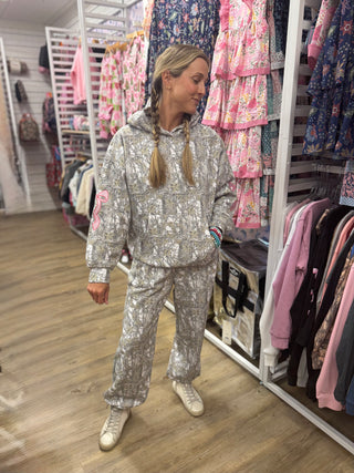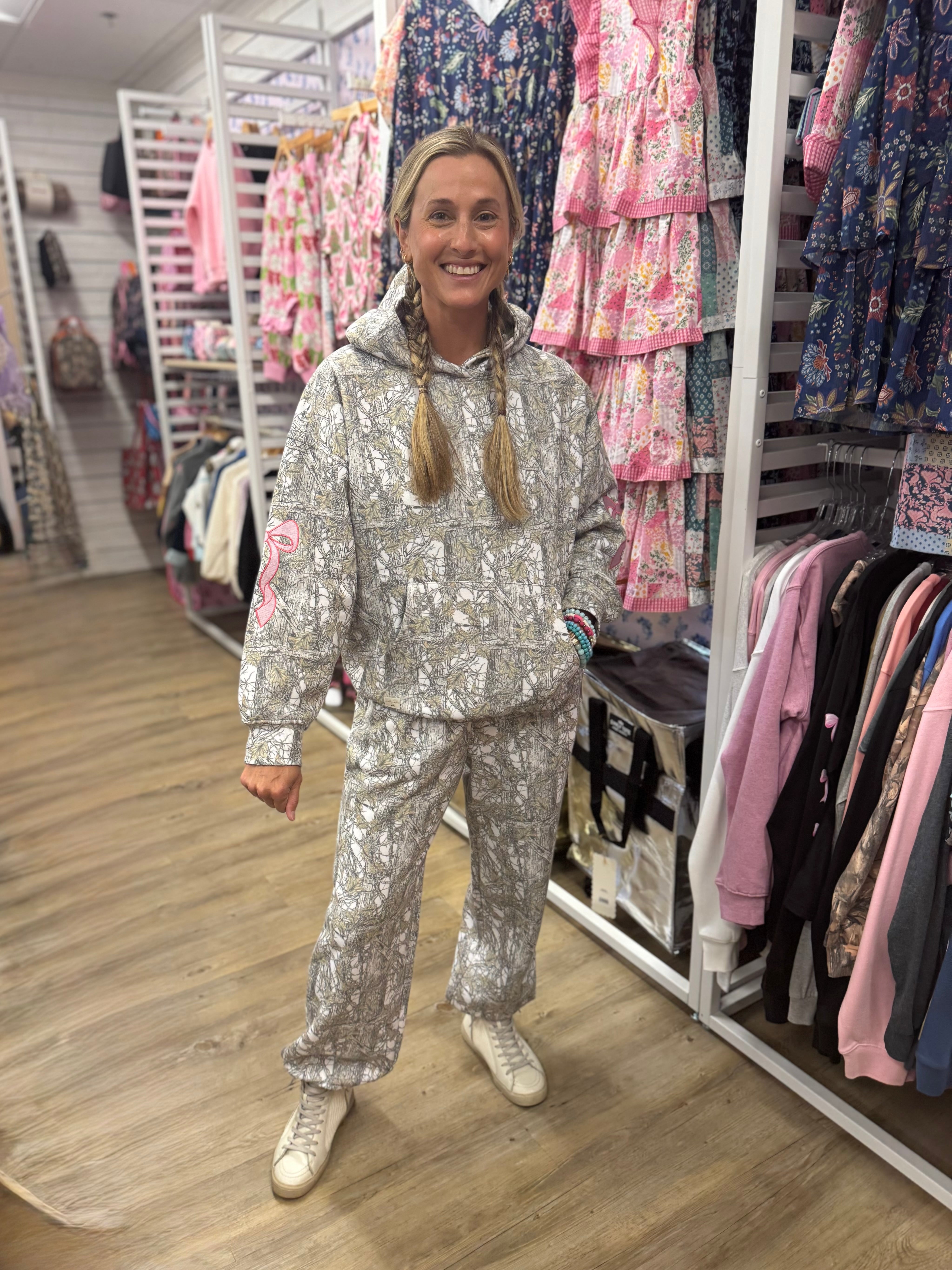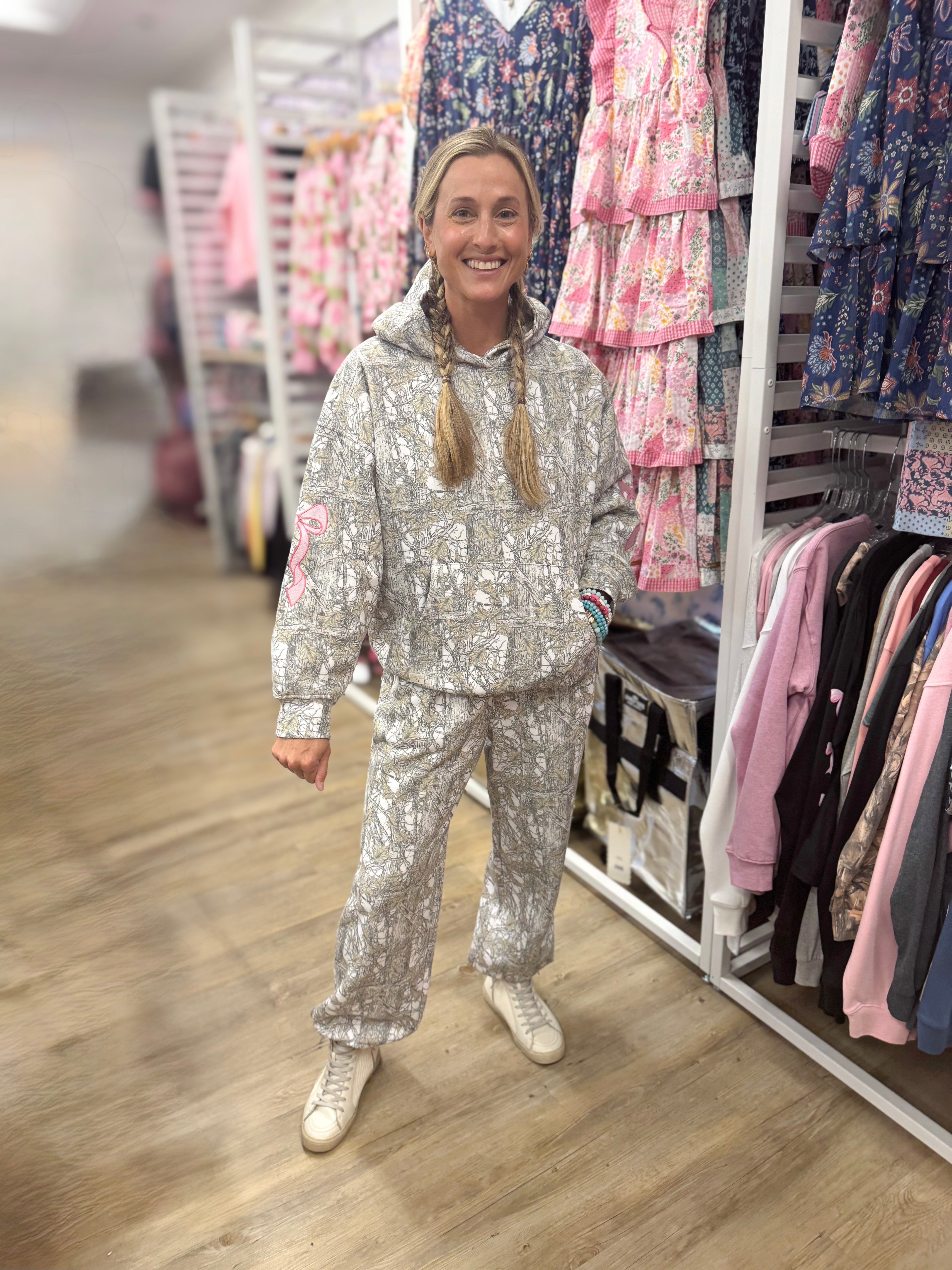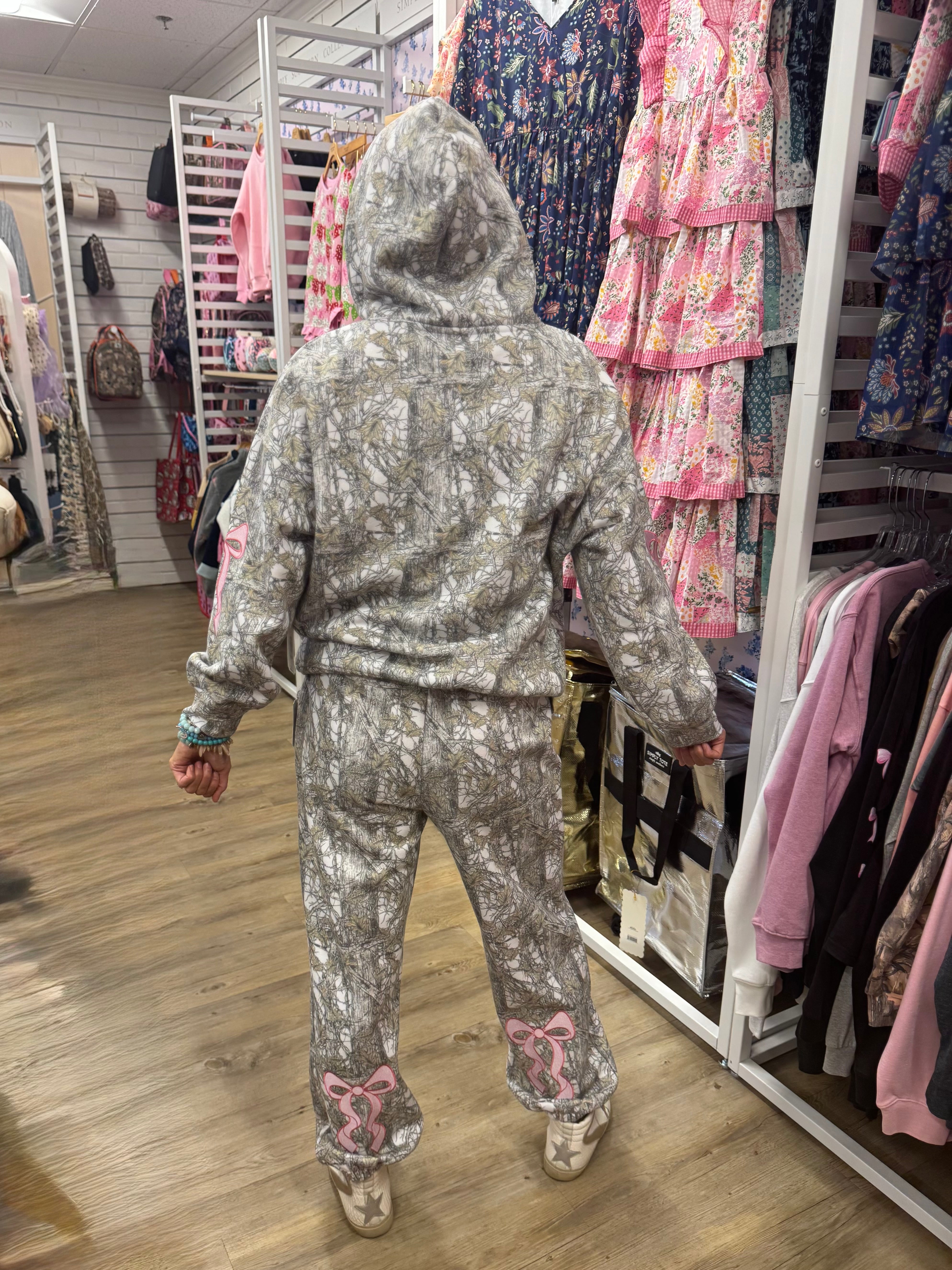 Hoodie Neckline, Rib Cuffs & Hem with embroidered bow and front kangaroo pocket.