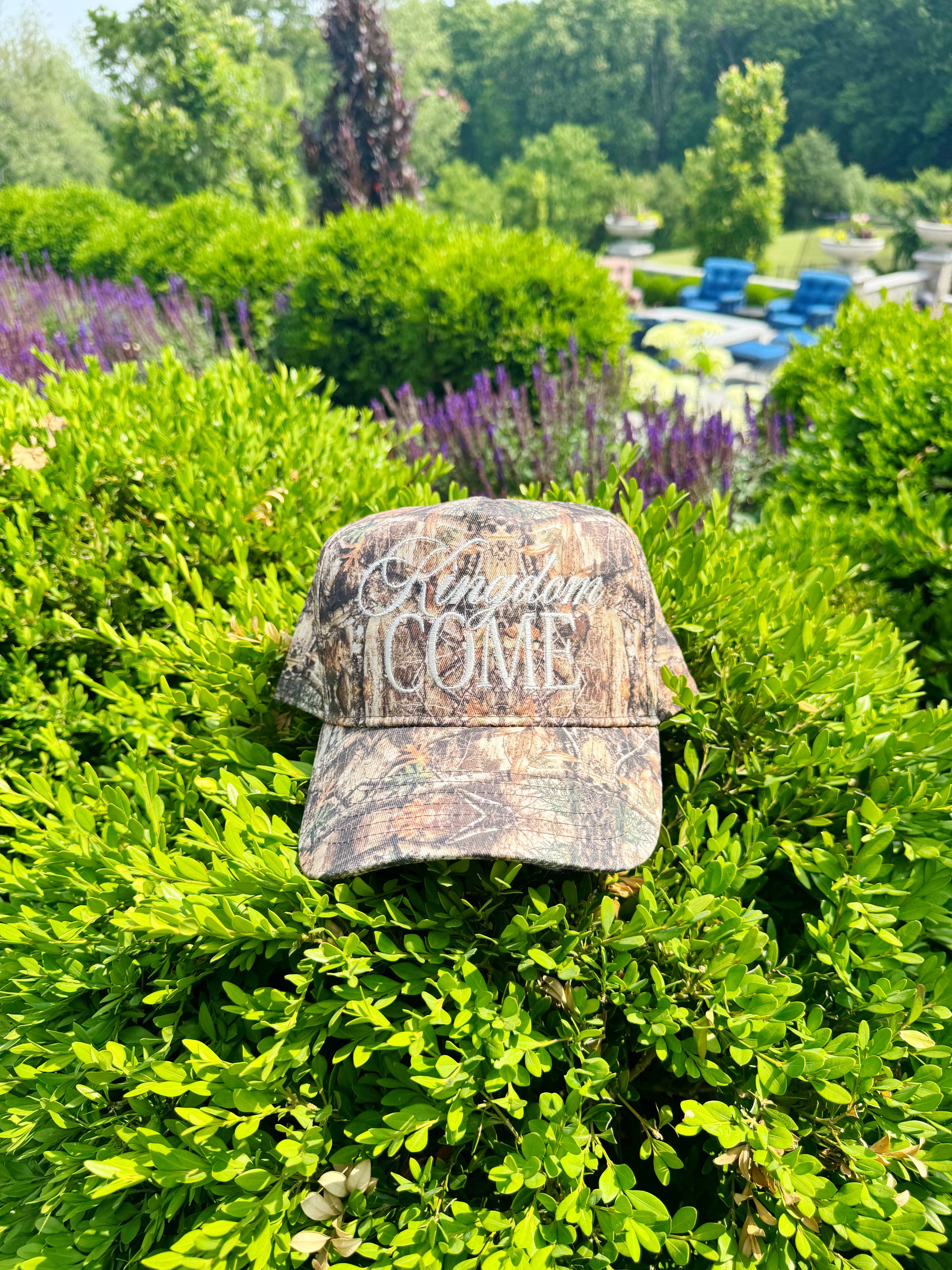 Embrace your faith with the Kingdom Come Camo Hat, designed to blend rugged style with a meaningful message. Trucker hat embroidered - Canvas Hat Solid - no mesh backing